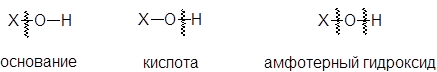 Продукты прямого или косвенного взаимодействия оксидов с водой являются либо основаниями, либо кислотами, либо веществами, способными проявлять как свойства оснований, так и свойства кислот (амфотерные гидрокисиды). Примеры оснований NaOH Ca(OH)2 Fe(OH)3