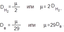 2 а.е.м. – молекулярная масса водорода. 29 а.е.м. – средняя молекулярная масса воздуха. Зная плотность данного газа по водороду, воздуху или по другому газу, можно вычислить искомые молекулярные (молярные) массы веществ — μ или М. В химических реакциях газы взаимодействуют друг с другом так, что их объемы, а также объемы получающихся газов относятся друг к другу как небольшие целые числа при одинаковых условиях. Эти числа — это коэффициенты перед формулами веществ в уравнении химической реакции. Примеры N2 + 3H2 = 2NH3 N2 + O2 = 2NO Отношения объемов газов в этих двух реакциях соответственно равны: