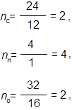 Итак, истинная формула вещества (СН2О)2, или С2Н4О2. 2. Так же определим молекулярную массу вещества: µ = 29 · 2,07 = 60 а. е. м. Затем определим содержание каждого химического элемента в а. е. м. (m c; m н; m o), зная их содержание, выраженное в процентах: m c = 60 · 0,400 = 24 а. е. м., m н = 60 · 0,0667 = 4 а. е. м., m o = 60 · 0,533 = 32 а. е. м.