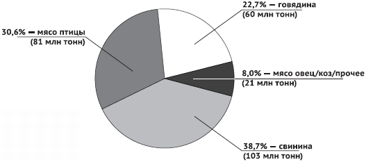 Многократные предсказания о неизбежности появления мирового дефицита животных белков пока не оправдались. Производство мясных продуктов росло с 1950 г. быстрее, чем население Земли. На каждого жителя планеты в 1950 г. приходилось 18 кг мяса. В 1987 г. эта цифра увеличилась до 31 кг, в 1996‑м – до 36 и к 2008 г. достигла 42 кг. В индустриально развитых странах потребление мяса в расчете на одного человека составляло 80 кг к 1990 г. и с тех пор почти не менялось. Это не относится к России, Украине и другим странам СНГ, где производство мясных продуктов после 1991 г. заметно падало. Рост производства происходил в основном в азиатских странах, прежде всего в Китае, где в течение последних 20 лет потребление животных продуктов на каждого жителя почти удвоилось, достигнув 43 кг. В мировом балансе мясных продуктов в 2007 г. на долю свинины приходилось 39%, на долю мяса птицы – 30 и на долю говядины – 24%. Остальные 7% баланса давали баранина, козлятина, конина, верблюжье мясо, оленина, крольчатина и все другие продукты животноводства [21].