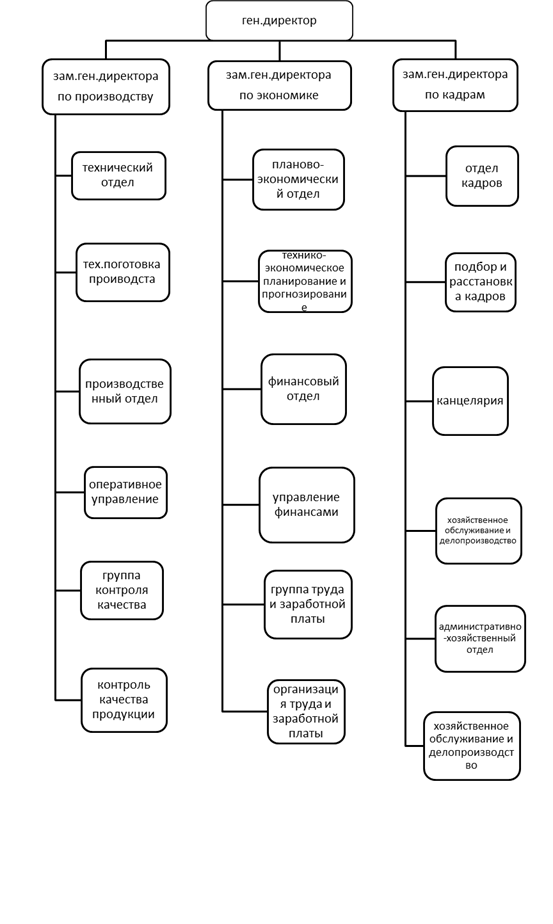Оценка длительности акций (напротив каждого задания нужно проставить приблизительное время для его выполнения, а также просуммировать и определить ориентировочно общее время. Нужно учесть то, что работа зачастую требует столько времени, сколько его есть в распоряжении, поэтому, устанавливая для отдельных дел конкретные сроки, необходимо укладываться именно в данное время). Быть организованным, независимо от того, относится ли это к окружающему пространству или к вашему времени, - означает быть подготовленным. Это означает чувствовать себя собранным, владеть ситуацией, быть готовым использовать все имеющиеся возможности и справиться с любыми сюрпризами и неожиданностями, которые жизнь создает на вашем пути. Бюрократический тип структур управления имеет много разновидностей, но наиболее распространенной является линейно-функциональная организация, до сих пор широко используемая компаниями всего мира. Дайте описание представленного на рис. 1 фрагмента организационной структуры управления предприятием. Укажите какие функции управления выполняют названные звенья структуры, кому подчиняются, с кем взаимодействуют. Определите к какому виду структур относится рассматриваемый фрагмент. Дайте необходимые пояснения. Среда функция менеджмент структура управление Произвести обучение по повышению квалификации имеющихся работников Принять на работу квалифицированных специалистов Повышение квалификации работников Защита социальных интересов работников Улучшить освещение производственных помещений Улучшение условий труда, быта и отдыха Внедрение новых технологических процессов изготовления продукции Покупка нового оборудования Улучшение качества оборудования Закупка более дорогого сырья Контроль качества сырья Основу линейно-функциональной структуры составляет "шахтный" принцип построения и специализация управленческого персонала по функциональным подсистемам организации. По каждой подсистеме формируются "иерархия" служб ("шахта"), пронизывающая всю организацию сверху донизу. Результаты работы любой службы аппарата управления оцениваются показателями, характеризующими реализацию ими своих целей и задач. Например, работа служб, управляющих производством, - показателями выполнения графика выпуска продукции, затрат ресурсов, производительности труда, качества, использования производственных мощностей. Для оценки служб, осуществляющих управление персоналам, используются такие параметры, как текучесть кадров, дисциплина труда и другие. Соответственно строится и система материального поощрения, ориентированная прежде всего на достижение высоких показателей каждой службой. При этом конечный результат работы организации в целом становится как бы второстепенным, ибо считается, что все службы в той или иной мере работают на его достижение. Многолетний опыт использования линейно-функциональных структур управления показал, что они наиболее эффективны там, где аппарату управления приходится выполнять множество рутинных, часто повторяющихся процедур и операций при сравнительной стабильности управленческих задач и функций: посредством жесткой системы связей обеспечивается четкая работа каждой подсистемы и организации в целом. В то же время выявились и существенные недостатки, среди которых в перв