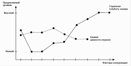 Создание свободного от конкуренции рыночного пространства. Возможность не бояться конкуренции. Создание нового спроса и овладение им. Разрушение компромисса «ценность - издержки». Построение всей системы деятельности компании в соответствии с задачей одновременного достижения дифференциации и снижения издержек. Создание свободного от конкуренции рыночного пространства.