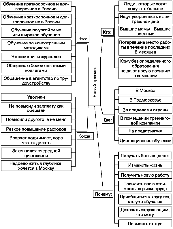 Это был подготовительный этап. Теперь вам и вашим коллегам по маркетингу на предприятии нужно найти среди этих «5W», превратившихся в 25 или, может быть, в 65W, новые интересные сочетания, которые до сих пор не были никем оценены как перспективный рынок. Положите лист перед собой. Смотрите на него и прокручивайте в голове различные комбинации W, чтобы натолкнуться на оригинальную. Для того чтобы немного облегчить задачу, можно уменьшить список до 5–7 позиций по каждому W. Естественно, вычеркивать надо те, которые кажутся вам самыми маловероятными для сегментации или пересекающимися с другими. Для более удобного представления общей картины можно воспользоваться способом, который называется mind mapping (рис. 9.1).