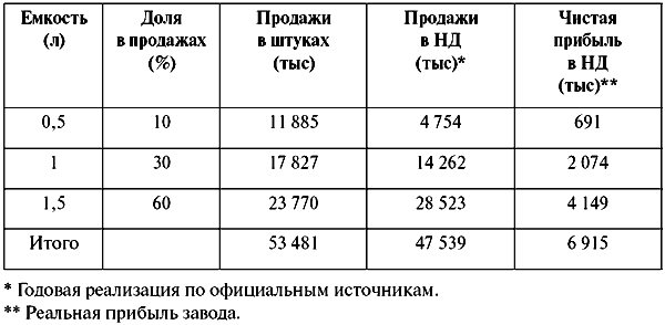 В рамках книги мы должны решить задачу по развитию компании New Age, которая разливает и продает воду марки «Курортная». За последние три года эта компания вышла из состояния локальной (в 2001 году доля рынка меньше допустимой погрешности исследований по всей СТРАНЕ в 1,4 %). Последний, 2003 год, стал наиболее ответственным в истории развития New Age, впервые была сделана инвестиция в рекламу торговой марки. Это были именно инвестиции, так как на момент начала кампании мы не могли сформировать бюджет по методу, например, «от прошлых продаж», так как любые отчисления не смогли бы создать требуемый денежный запас для организации рекламной кампании. Фирма рискнула и смогла выполнить поставленные перед ней задачи: нарастила долю рынка и при этом подняла розничную стоимость одного условного литра воды с 0,75 наших «долларов» до 0,8. Инвестиции в рекламу были возращены полностью в течение этого же 2003 года. В 2003 году New Age продала товаров на 47 539 000 «наших долларов» в виде денежного объема емкости рынка. Однако при анализе структуры стоимости продукта (табл. П9) видно, что чистой прибыли было получено 6 915 000 НД.