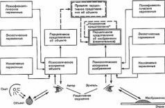 Илл. 10 Оригинал (объект) и изобразительное послание (мессидж). А Эрнст Вебер предлагает еще более сложный вариант (илл.9). Авторское изобразительное послание – мессидж – (илл.10) никогда не может быть абсолютной копией объекта. В первую очередь возникают определенные соотношения между передатчиком и каналом информации (цепочка: автор – изображение). Этот канал в очень большой степени поддается влиянию субъективизма автора, т.е. его видению вещей. Но окончательный выбор лежит на воспринимающем (зрителе): он точно так же субъективен, потому что воспринимаемое постоянно соотносится с тем, что зритель об этом знает, то есть какую это представляет информационную ценность. Таким образом, на этой схеме показаны те психологические трансформации, которые претерпевает объект на пути его превращения в изображение, а затем в визуальный образ, уже воспринимаемый зрителем. Заметим, что все эти трансформации – психологического свойства, и не имеют ничего общего с техническими искажениями, присущими любой воспроизводящей системе. Иногда эти искажения обусловлены, не столько несовершенством воспроизводящей системы, сколько неправильным пониманием задач, стоящих перед ней, вследствие психологических трансформаций, совершенно, как мы видим, неизбежных. На илл.11 показана последовательность наблюдения и восприятия изображения. Дело, конечно, не в том, какая схема точнее, ‑ оставим это психологам, дело в том, что видимое и знаемое в нашем сознании сплетается самым причудливым образом. Это лейтмотив книги. Беглое перечисление особенностей психологического восприятия, надеюсь, убедило читателя в том, что, с одной стороны, изображение объекта и сам объект воспринимаются не подобными, хотя с физиологической точки зрения они подобны, и, с другой стороны, подчас нас вполне устраивает их подобие, хотя с точки зрения инструментальной, физической они сильно отличаются друг от друга. В верхней части схемы (илл.8) в действительности не меньше, если не больше, переменных, влияющих на ее функционирование, чем в нижней части, причем большинство этих переменных связано с субъективными ощущениями и другими особенностями, которые не поддаются точному измерению.