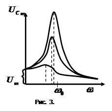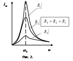 Резонансом называется резкое возрастание амплитуды вынужденных колебаний при приближении частоты внешнего напряжения к частоте свободных незатухающих колебаний контура. Резонансной кривой называют зависимость амплитуды от частоты внешнего напряжения. Резонансные кривые для силы тока показаны на рис.2. Как видно из выражения (5), амплитуда силы тока имеет максимальное значение при