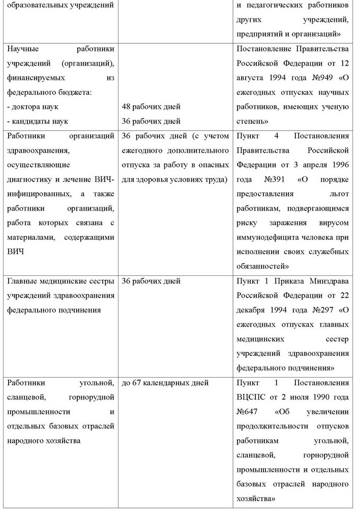 Трудовой кодекс РФ четко указывает продолжительность отпусков. Гарантируя работникам ежегодный оплачиваемый отпуск продолжительностью 28 календарных дней (ст. 115 ТК РФ), для определенных категорий лиц законодательство устанавливает удлиненный основной отпуск, т.е. продолжительностью более, чем 28 дней. Удлиненные отпуска предоставляются следующим сотрудникам: • Сотрудникам моложе 18 лет должен предоставляться отпуск продолжительностью 31 календарный день (ст. 267 ТК РФ); • инвалидам предоставляется отпуск продолжительностью 30 календарных дней (ст. 23 Закона от 24 ноября 1995 г. № 181, с изменениями от 24 июля 1998 г., 4 января, 17 июля 1999 г., 27 мая 2000 г., 9 июня, 8 августа, 29, 30 декабря 2001 г., 29 мая 2002 г., 10 января, 23 октября 2003 г., 22 августа, 29 декабря 2004 г., 31 декабря 2005 г – ФЗ «О социальной защите инвалидов в Российской Федерации»); • сотрудникам работающим в детских учреждениях отпуск предоставляется продолжительностью в 42 календарных дня (постановление Правительства РФ от 1 октября 2002 г. № 724); • сотрудникам образовательных, учебных учреждений и учреждений здравоохранения, перечисленные в приложении к постановлению Правительства РФ от 1 октября 2002 г. № 724 предоставляется отпуск продолжительностью 42 (56) календарных дней. В соответствии со статьей 291 ТК РФ продолжительность основного отпуска сотрудников, заключившими трудовой договор на срок не более двух месяцев, отпуск предоставляется продолжительностью два рабочих дня за месяц работы. В соответствии со статьей 295 ТК РФ сезонным сотрудникам продолжительность основного отпуска равна двум рабочим дням за месяц работы. Сотрудникам‑надомникам также предоставляется отпуск продолжительностью не менее 28 календарных дней. Так как в соответствии с ч. 4 ст. 310 ТК РФ этим сотрудникам отпуска предоставляются на общих основаниях, т.е. по правилам трудового законодательства. Минимальная продолжительность основного оплачиваемого отпуска составляет 28 календарных дней, максимальный предел продолжительности отпуска не установлен. Отдельным категориям работников в соответствии с законодательством предоставляется увеличенный основной отпуск, продолжительность которого составляет более 28 календарных дней. В следующей таблице мы более подробно отметим группы работников, имеющих право на увеличенный основной отпуск: