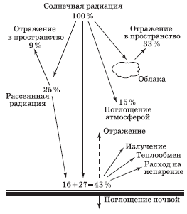 Энергия Солнца. Она распространяется в пространстве в виде электромагнитных волн. Для организмов важны длина волны воспринимаемого излучения, его интенсивность и продолжительность воздействия. Около 99 % всей энергии солнечной радиации составляют лучи с длиной волны λ = 170 … 4000 нм, в том числе 48 % приходится на видимую часть спектра (λ = 390 … 760 нм), 45 % – на близкую инфракрасную (λ = 760 … 4000 нм) и около 7 % – на ультрафиолетовую (λ < 400 нм). Преимущественное значение для фотосинтеза имеют лучи с λ = 380 … 710 нм. Длинноволновая (дальняя инфракрасная) солнечная радиация (λ > 4000 нм) незначительно влияет на процессы жизнедеятельности организмов. Ультрафиолетовые лучи с λ > 320 нм в малых дозах необходимы животным и человеку, так как под их действием в организме образуется витамин D. Излучение с λ < 290 нм губительно для живого, но до поверхности Земли оно не доходит, поглощаясь озоновым слоем атмосферы. При прохождении через атмосферный воздух солнечный свет (рис. 3.2) отражается, рассеивается и поглощается. Чистый снег отражает примерно 80–95 % солнечного света, загрязненный – 40–50 %, черноземная почва – до 5 %, сухая светлая почва – 35–45 %, хвойные леса – 10–15 %. Однако освещенность земной поверхности существенно колеблется в зависимости от времени года и суток, географической широты, экспозиции склона, состояния атмосферы и т. п. Вследствие вращения Земли периодически чередуются светлое и темное время суток. Цветение, прорастание семян у растений, миграция, зимняя спячка, размножение животных и многое другое в природе связаны с длительностью фотопериода (длиной дня). Необходимость в свете для растений обусловливает быстрый их рост в высоту, ярусную структуру леса. Водные растения распространяются преимущественно в поверхностных слоях водоемов.