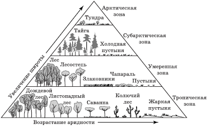 Рис. 3.4. Зависимость типа растительности от климатических условий Наземные растения получают воду главным образом из почвы. Малое количество осадков, быстрый дренаж, интенсивное испарение либо сочетания этих факторов ведут к иссушению, а избыток влаги – к переувлажнению и заболачиванию почв. Баланс влаги зависит от разницы между количеством выпавших осадков и количеством воды, испарившейся с поверхностей почвы и растений (путем транспирации [15]). В свою очередь процессы испарения непосредственно зависят от относительной влажности атмосферного воздуха. При влажности, близкой к 100 %, испарение практически прекращается, и если дополнительно понижается температура, то начинается обратный процесс – конденсация (образуется туман, выпадают роса, иней). Помимо отмеченного, влажность воздуха как экологический фактор при своих крайних значениях (повышенной и пониженной влажности), усиливает воздействие (усугубляет действие) температуры на организм. Насыщение воздуха парами воды редко достигает максимального значения. Дефицит влажности – разность между максимально возможным и фактически существующим насыщением при данной температуре. Это один из важнейших экологических параметров, поскольку характеризует сразу две величины: температуру и влажность. Чем выше дефицит влажности, тем суше и теплее, и наоборот. Режим осадков – важнейший фактор, определяющий миграцию загрязняющих веществ в природной среде и вымывание их из атмосферы. Подвижность среды. Причинами возникновения движения воздушных масс (ветра) являются в первую очередь неодинаковый нагрев земной поверхности, вызывающий перепады давления, а также вращение Земли. Ветер направлен в сторону более прогретого воздуха. Ветер – важнейший фактор распространения на большие расстояния влаги, семян, спор, химических примесей и т. п. Он способствует как снижению околоземной концентрации пыле‑и газообразных веществ вблизи места их поступления в атмосферу, так и повышению фоновых концентраций в воздушной среде вследствие выбросов далеких источников, включая трансграничный перенос. Ветер ускоряет транспирацию (испарение влаги наземными частями растений), что особенно ухудшает условия существования при низкой влажности. Кроме того, он косвенно влияет на все живые организмы суши, участвуя в процессах выветривания и эрозии. Подвижность в пространстве и перемешивание водных масс способствуют поддержанию относительной гомогенности (однородности) физических и химических характеристик водных объектов. Средняя скорость поверхностных течений лежит в пределах 0,1–0,2 м/с, достигая местами 1 м/с, у Гольфстрима – 3 м/с. Давление. Нормальным атмосферным давлением считается абсолютное давление на уровне поверхности Мирового океана 101,3 кПа, соответствующее 760 мм рт. ст. или 1атм. В пределах земного шара существуют постоянные области высокого и низкого атмосферного давления, причем в одних и тех же точках наблюдаются сезонные и суточные его колебания. По мере увеличения высоты относительно уровня океана давление уменьшается, снижается парциальное давление кислорода, усиливается транспирация у растений. Периодически в атмосфере образуются области пониженного давления с мощными воздушными потоками, перемещающимися по спирали к центру, которые называют циклонами. Для них характе