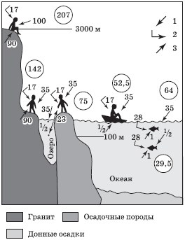 Рис. 3.5. Дозы получаемого радиоактивного облучения, мрад/г. (по Н. Ф. Реймерсу): 1 – космические лучи; 2 – внутренние α‑лучи и излучение 40K, содержащегося в живых организмах; 3 – излучение местных внешних источников Горные ландшафты благодаря значительной высоте над уровнем моря характеризуются повышенным вкладом космического излучения. Ледники, выполняя функцию поглощающего экрана, задерживают в своей массе излучение подстилающих коренных пород. Обнаружены различия в содержании радиоактивных аэрозолей над морем и сушей. Суммарная радиоактивность морского воздуха в сотни и тысячи раз меньше, чем континентального. На Земле есть районы, где интенсивность излучения в десятки раз превышает средние значения, например, районы месторождений урана и тория. Такие места называют урановыми и ториевыми провинциями. Стабильный и относительно более высокий уровень излучения наблюдается в местах выхода гранитных пород. Биологические процессы, сопровождающие образование почв, существенно влияют на накопление в последних радиоактивных веществ. При малом содержании гумусовых веществ их активность слабая, тогда как черноземы всегда отличались более высокой удельной активностью. Особенно она высока у черноземных и луговых почв, расположенных близко к гранитным массивам. По степени возрастания удельной активности почвы ориентировочно можно расположить в следующем порядке: торфяные; почвы степной зоны и лесостепи; черноземные; почвы, развивающиеся на гранитах. Влияние периодических колебаний интенсивности космического излучения у земной поверхности на дозу облучения живых организмов практически не существенно. Во многих районах земного шара мощность экспозиционной дозы, обусловленная излучением урана и тория, достигает уровня облучения, существовавшего на Земле в геологически обозримое время, при котором шла естественная эволюция живых организмов. В целом ионизирующее излучение более губительно воздействует на высокоразвитые и сложные организмы, причем человек отличается особой чувствительностью. Некоторые вещества распределяются в организме равномерно, например углерод‑14 или тритий, а другие накапливаются в определенных органах. Так, радий‑224, – 226, свинец‑210, полоний‑210 аккумулируются в костных тканях. Сильное воздействие на легкие оказывает инертный газ радон‑220, порой выделяющийся не только из залежей в литосфере, но и из минералов, добытых человеком и применяемых в качестве строительных материалов. Радиоактивные вещества могут накапливаться в воде, почве, осадках или в воздухе, если скорость их поступления превышает скорость радиоактивного распада. В живых организмах накопление радиоактивных веществ происходит при их попадании с пищей («правило биотического усиления», см. разд. 5.1.3).