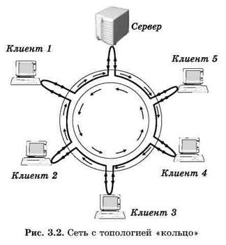 «Кольцо» (Ring). В данной топологии каждый из компьютеров соединяется с двумя другими так, чтобы от одного он получал информацию, а второму – передавал ее (рис. 3.2). Последний компьютер подключается к первому, и кольцо замыкается.