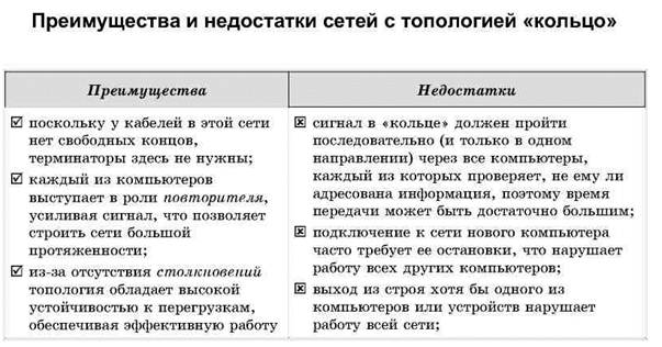 Несмотря на больший расход кабеля, характерный для сетей типа «звезда», эта топология имеет существенные преимущества перед остальными, что и обусловило ее широчайшее применение в современных сетях. Преимущества сетей типа «звезда-шина» 1. Надежность – подключение к центральному концентратору и отключение компьютеров от него никак не отражается на работе остальной сети; обрывы кабеля влияют только на единичные компьютеры; терминаторы не требуются. 2. Легкость при обслуживании и устранении проблем – все компьютеры и сетевые устройства подключаются к центральному соединительному устройству, что существенно упрощает обслуживание и ремонт сети. 3. Защищенность – концентрация точек подключения в одном месте позволяет легко ограничить доступ к жизненно важным объектам сети. Отметим, что при использовании вместо концентраторов более «интеллектуальных» сетевых устройств (мостов, коммутаторов и маршрутизаторов – подробнее о них будет рассказано позже) получается «промежуточный» тип топологии между активной и пассивной звездой. В этом случае устройство связи не только ретранслирует поступающие сигналы, но и производит управление их обменом.