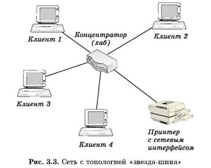 Здесь, так же как и для сетей с топологией «шина», недостатки несколько перевешивают достоинства, в результате чего популярные ранее кольцевые сети теперь используются гораздо реже. Активная топология «звезда» ( Active Star). Эта топология возникла на заре вычислительной техники, когда к мощному центральному компьютеру подключались все остальные абоненты сети. В такой конфигурации все потоки данных шли исключительно через центральный компьютер; он же полностью отвечал за управление информационным обменом между всеми участниками сети. Конфликты при такой организации взаимодействия в сети были невозможны, однако нагрузка на центральный компьютер была столь велика, что ничем другим, кроме обслуживания сети, этот компьютер, как правило, не занимался. Выход его из строя приводил к отказу всей сети, тогда как отказ периферийного компьютера или обрыв связи с ним на работе остальной сети не сказывался. Сейчас такие сети встречаются довольно редко. Гораздо более распространенной сегодня топологией является похожий вариант – «звезда-шина» (Star Bus), или «пассивная звезда» (рис. 3.3). Здесь периферийные компьютеры подключаются не к центральному компьютеру, а к пассивному концентратору, или хабу ( hub). Последний, в отличие от центрального компьютера, никак не отвечает за управление обменом данными, а выполняет те же функции, что и повторитель, то есть восстанавливает приходящие сигналы и пересылает их всем остальным подключенным к нему компьютерам и устройствам. Именно поэтому данная топология, хотя физически и выглядит как «звезда», логически является топологией «шина» (что и отражено в ее названии).