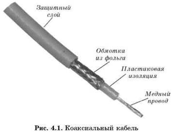 Еще десять–пятнадцать лет назад при создании сетей в основном применялся именно коаксиальный кабель, состоящий из передающей сигнал медной или алюминиевой жилы, слоя изоляции, экранирующей оплетки из медных проводов или алюминиевой фольги и защитной внешней оболочки (рис.4.1). Для передачи сигнала в коаксиальном кабеле использовалась центральная жила, тогда как оплетка заземлялась, выступая в роли «электрического нуля».