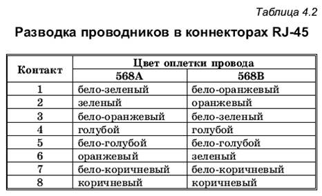 Благодаря своей дешевизне, легкости в установке и универсальности (может использоваться в большинстве сетевых технологий), неэкранированная витая пара сейчас является самым распространенным типом кабеля, используемым при построении локальных сетей. Экранированная витая пара, несмотря на большую помехозащищенность, не получила широкого распространения из-за сложностей в установке – требуется заботиться о заземлении, да и кабель по сравнению с неэкранированной витой парой более жесткий. Витая пара подключается к компьютерам и другим устройствам с помощью восьмиконтактного разъема RJ-45 (Registered Jack 45). Этот коннектор (рис.4.6) похож на применяемый в телефонных линиях коннектор RJ-11, только немного больше него. В табл.4.2 приведено описание способов заделки кабеля «витая пара» в коннектор RJ-45 в соответствии со стандартами EIA/TIA 568A и 568B; эта операция выполняется с помощью специального обжимного инструмента. (Если расположить разъем контактами вверх и от себя, то нумеровать их надо слева направо, от 1 до 8.)