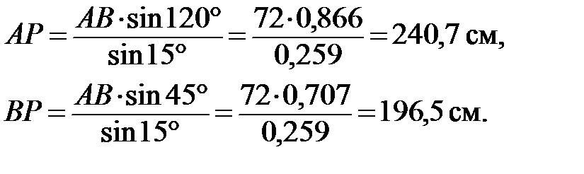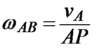 Рассмотрим движение шатуна в данный момент времени как вращательное относительно оси, проходящей через мгновенный центр скоростей Р перпендикулярно неподвижной плоскости, по отношению к которой происходит плоское движение. Угловая скорость шатуна в этом случае определяется из соотношения Расстояния АР и BP определим из решения треугольника АВР, применив теорему синусов. Для заданного положения механизма получим