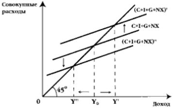 Рис. 48.1. - Влияние государственных расходов и налогообложения на равновесный уровень дохода Увеличение государственных расходов и/или снижение налогообложения сдвигают вверх линию С + I + G + NX и ведет к росту дохода до уровня Y¢. Снижение государственных расходов и/или увеличение налогообложения сдвигают вниз линию С + I + G + NX и ведет к снижению дохода до уровня Y ". Так, если правительство приняло решение увеличить на 20 млрд. долл. государственные закупки (а делается это за счет средств бюджета), то линия С + I + G + NX переместится выше, в положение (С + I + G + NX). Например, DG = 20 млрд. долл.; предельная склонность к потреблению (МРС) = 0,80; предельная склонность к сбережению (MPS) = 0,20; мультипликатор (к) при этих условиях равен 5. Прирост дохода составит: DY = DG х k = (20 х 5) = 100 млрд. долл. Здесь очень важно подчеркнуть, что увеличение правительственных расходов финансируется не за счет притока налоговых поступлений. Источником государственных расходов является в нашем примере бюджетный дефицит. Власти сознательно идут на этот шаг, стремясь добиться увеличения совокупного спроса и достижения уровня полной занятости. Если же экономика «перегрета», то правительство может снизить уровень государственных расходов. График совокупных расходов при этом сдвинется вниз, до положения (С + I + G + NX).
