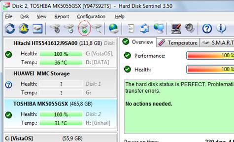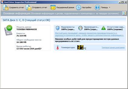 Главное окно программы показывает состояние и основные характеристики (надежность, производительность, отсутствие ошибок) жесткого диска и температуру.