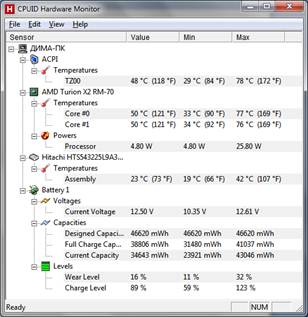 Обратите внимание на строку Voltages. Здесь показываются текущее значение напряжения в столбце Value, минимальное и максимальное (Min и Max) значения. Стоит учесть, что минимальное и максимальное значения зафиксированы те, когда программа была запущена. Поэтому для выполнения диагностики блока питания необходимо, чтобы CPUID Hardware Monitor находилась какое-то время запущенной.