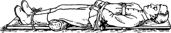 Рис. 9 Иммобилизация к доске при переломе позвоночника. При переломе бедра неподвижность всей конечности осуществляется длинной шиной - от стопы до подмышечной впадины.