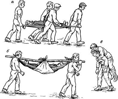 Рис. 10 Способы переноски пострадавших: а - на носилках; б - с помощью подручных средств; в - на себе.