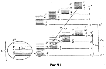 В этом приближении расстояние между двумя соседними линиями вращательной структуры равно 2В, как и в чисто вращательных спектрах. 9.3.3. Электронно–колебательно–вращательные спектры. В общем виде систему всех возможных энергетических состояний двухатомной молекулы можно представить уравнением