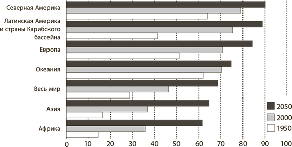 Рис. 1.3. Движение в сторону урбанизации Городское население, % к общему