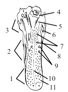 Рис. 17. Язык собаки: 1 – кончик языка (apex lingvae), 2 – тело языка (corpus lingvae), 3 – корень языка (radix linvae), 4 – надгортанник (epiglotis), 5 – язычно‑надгортанная складка (plica glossaepiglottica), 6 – нёбная миндалина (tonsilla palatina), 7 – конические сосочки (papillae conicae), 8 – листовидные сосочки (papillae faliatae), 9 – валиковидные сосочки (papillae vallatae), 10 – язычный желобок(sulcus lingvalis), 11 – грибовидные сосочки (papillae fungiformes)