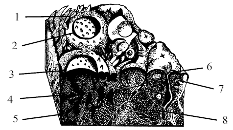 Рис. 18. Поверхность языка на границе: 1 – нитевидные сосочки (papilllae filiformes), 2 – валиковидные сосочки (papillae vallatae), 3 – вкусовые луковицы, 4 – миндалины языка, 5 – лимфатические узелки, 6 – слизистые железы, 7 – серозные железы, 8 – мышцы языка