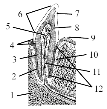 Рис. 26. Скелет зуба: 1 – кость, 2 – цемент, 3 и 8 – дентин, 4 – шейка, 5 – пульпа, 6 – коронка, 7 – эмаль, 9 – край десны, 10 – периодонт, 11 – канал, 12 – корень