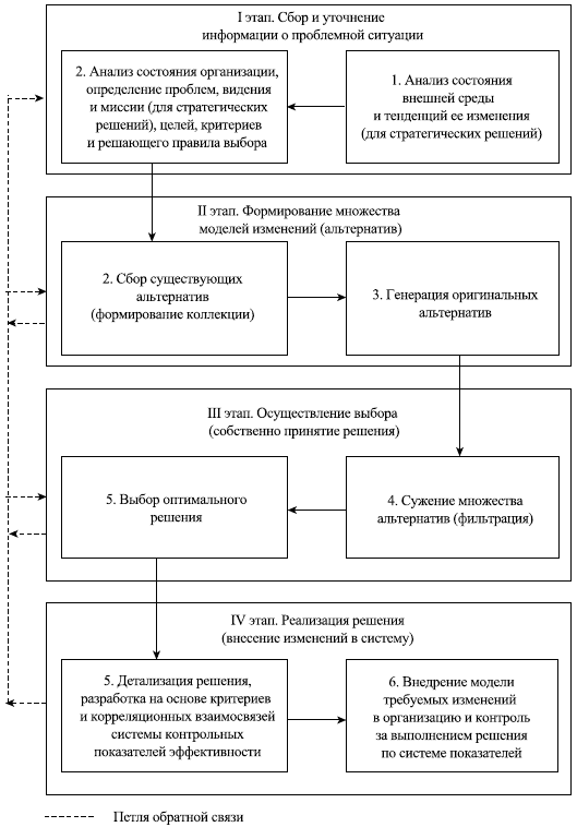 Этапизацию процесса разработки управленческих решений легко провести, опираясь на структурную схему процесса РУР (рис. 4.3). ЛПР при разработке управляющего решения имеет дело прежде всего с информацией и формирует на ее основе детализированную модель актуальных изменений, т. е. решение. Определим, какая информация необходима для генерирования основных сущностей (нематериальных компонент) УР – проблем, целей, критериев и их весов, ресурсов и ограничений, альтернатив, правил фильтрации и выбора.