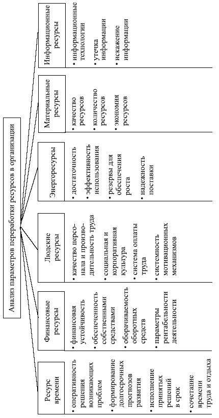 Внутренняя среда организации представляет собой стратегический ресурс ее развития. Как и любая система, организация допускает описание ее содержания с помощью различных языков (экономического, технического, управленческого, социологического, экологического и т. д.) и представление ее посредством различных подсистем – это обусловлено постановкой конкретной задачи. Поэтому анализ внутренней среды организации всегда индивидуален и неповторим. Но общее для всех организаций – полнота анализа и его многофакторность. Иногда анализ проводится по функциональному принципу, когда объектом анализа выступают функциональные подразделения организации, но такой подход может не обеспечить требуемой полноты и целостности результата. Или проводится стратегический анализ по отдельным бизнесам или бизнес‑процессам. На наш взгляд, рационально проводить анализ внутренней среды организации по двум направлениям: анализ эффективности переработки основных видов ресурсов в организации и анализ уровня менеджмента в организации (рис. 5.6 и 5.7). В качестве ресурсов целесообразно рассматривать время, энергию, финансы, материалы, информацию и людские ресурсы. Анализ характеристик менеджмента в организации состоит из анализа уровня стратегии, качества торговой марки, организационной структуры, имиджа, структуры затрат и инновационности организации. Подобный анализ внутренней среды назовем анализом переработки ресурсов и менеджмента (ПРиМ‑анализ).