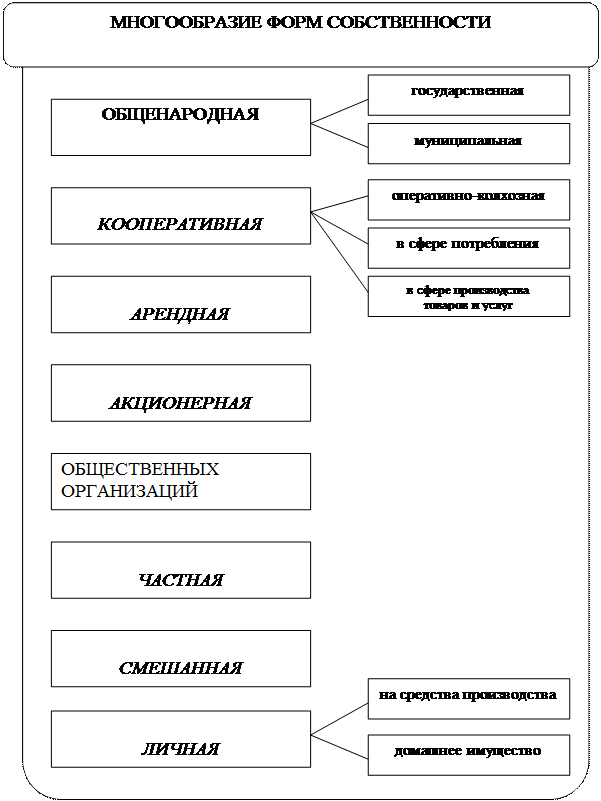У країнах з ринковою економікою існують два основних типи власності: приватна та державна. Усі інші різновиди — це похідні від них і можуть існувати у змішаних формах. Приватна власність виступає як індивідуальна, сімейна і своєрідна колективна. Колективна власність може існувати як групова власність господарських об'єднань громадян (наприклад, кооперативна, акціонерна), власність громадських організацій та об'єднань (власність профспілок, політичних партій, інших громадських об'єднань). Суспільна (державна) власність здебільшого існує в таких формах: загальнодержавна (республіканська) і комунальна (власність адміністративно-територіальної одиниці).
