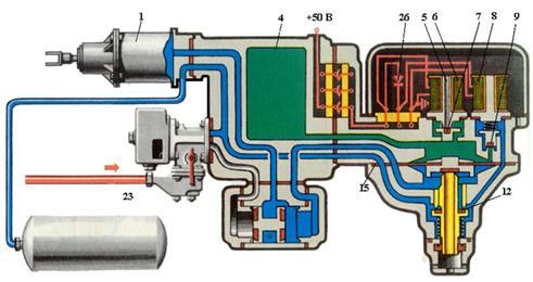 Для отпуска ЭПТ ручка КМ переводится в 1 положение, при этом теряет питание катушка ВО, его клапан открывается сообщая РК и полость над поршнем и диафрагмой с атмосферой, под действием большего давления из ТЦ снизу поршень перемещается вверх и открывает выпускной клапан который сообщает ТЦ с атмосферой. При ЭПТ возможен ступенчатый отпуск, путем перевода ручки КМ во 2 положение. Возможные неисправности ЭВР – 305. 1) При отпущенных ЭПТ дутье воздуха из под крышки. Причина: пропуск клапана ВТ. Действие: перейти на автотормоза или при возможности отключить тормоз вагона, если он не хвостовой. 2) В тормозном положении дутье воздуха из-под крышки. Причина: пропуск клапана ВО. Действие: перейти на автотормоза или при возможности отключить тормоза вагона, если он не хвостовой. 3) В положении перекрыша происходит наполнение ТЦ. Причина: пробой селенового вентиля. Действие: как в пункте 1. 4) После торможения ЭПТ тормоз отдельного вагона не отпускает. Действие: отпустить тормоз, выкрутить пробку из ТЦ и далее как в пункте 1. Взаимодействие ВР и ЭВР при торможении. 1) Торможение положением 5э. Мгновенно срабатывает на торможение ВР и перепускает воздух из ЗР в ТЦ, одновременно воздух из ТМ через ВР 292 перетекает в ЗР и в момент торможения падает незначительно давление в ТМ. Если на отдельном вагоне не срабатывает на торможение ЭВР, то сработает на торможение ВР, который выдаст небольшое давление в ТЦ. При переводе ручки КМ в 4 положение тормоз этого вагона отпустит, а при переводе в 3 положение продолжает держать. 2) Торможение 5 положением. Мгновенно срабатывает на торможение ЭВР, а КМ разряжает УР и ТМ. Давление в ЗР (золотниковой части ВР) падает быстрее, чем в ТМ (магистральной камере ВР), поэтому ВР 292 на торможение не срабатывает. Если на отдельном вагоне не сработало ЭВР, то сработает ВР и выдаст давление в ТЦ, в соответствии с разрядкой в ТМ. Тормоз этого вагона продолжает держать при переводе ручки КМ в 4 или 3 положение.