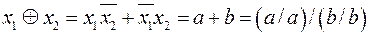 Доказательство справедливости (1.6) аналогично доказательству равенства (1.5). Формула служит для замены операции «ИЛИ» на операции «И» и «НЕ». Выражение (1.6) является формулой преобразования базиса {И, ИЛИ, НЕ} в базис {И, НЕ}. Пример 1.6.3