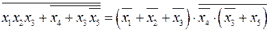 Для недопущения возможных ошибок при написании двойственной формы функций, рекомендуется в оригинале предварительно расставить скобки, дополнительно учитывающие ранги операций. Затем, в полученной двойственной форме, скобки, не изменяющие порядок выполнения операций, удаляются. Пример 2.2.2.