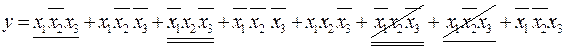 Согласно аксиомы 9, значение подчёркнутых минтермов равно «0». Аксиома 2 упрощает полученный результат.