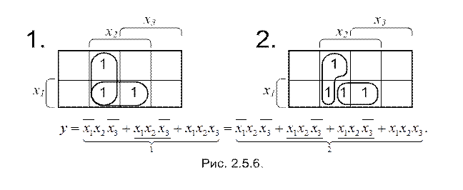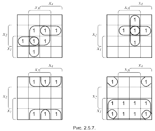 Составление аналитического вида минимизированной функции уже было показано в примере 2.5.13. Эти же действия для более сложного случая представлено в примере 2.5.14. В процедуре минимизации функций обычно не расписывают действия как это сделано в примере 2.5.14. Можно сразу же составлять минтермы, не включая в них координаты заключённые в скобки.