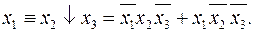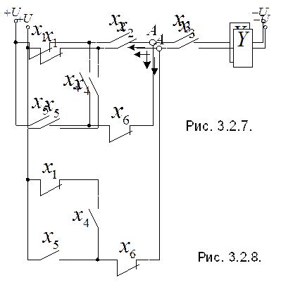 Схемы с мостиковыми контактами непосредственно описать логически не представляется возможным. Для выполнения этой операции необходимо сначала преобразовать исходную схему таким образом, чтобы мостиковый контакт был включён последовательно. Пример 3.2.1. В заданной схеме (Рис. 3.2.7) присутствует мостиковый контакт обходимо цепь питания катушки