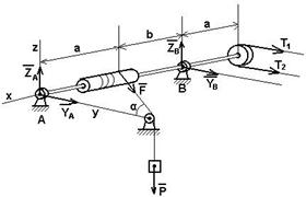 На ось Х проекции всех сил равны нулю P cosa + T1 + T2 + RAy + RBY = 0 (1) - P sina + RAz + RBz = 0 (2) r2P + r1T1 – r1T2 = 0 (3) b*P sina - (a + b)RBz = 0 (4) b*P cosa - aT1 – aT2 + (a + b)RBy = 0 (5) Решая эту систему уравнений, находим, что T1 =2.7 kH, T2 =1.35 kH, RAz = 0.36 kH, RAy = -6.3 kH, RBz, = 0.54 kH, RBy. = 0.69 kH.