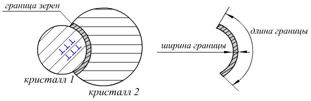 Граница зерен представляет собой слой атомов, кристаллографическое положение которого не связано ни с одним из кристаллов. Кристаллы по-разному повернуты. Ширина границы зерен достигает 2-3 межатомных расстояния, а длина на несколько порядков превышает ширину.