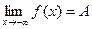 Пусть функция f(x) определена в некоторой окрестности точки х = а (т.е. в самой точке х = а функция может быть и не определена) Определение: Число А называется пределом функции f(x) при х®а, если для любого e>0 существует такое число D>0, что для всех х таких, что 0 < ïx - aï < D верно неравенство ïf(x) - Aï< e. То же определение может быть записано в другом виде: Если а - D < x < a + D, x ¹ a, то верно неравенство А - e < f(x) < A + e. Запись предела функции в точке: Определение: Если f(x) ® A1 при х ® а только при x < a, то