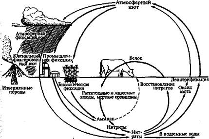 Основная часть фиксированного азота почвы поглощается растениями, но часть его соединений выносится в реки и поступает в водоемы, в том числе в моря. Больше всего солей аммония, нитратов и нитритов находится в водах устьев рек и у берегов морей, в глубинных частях водоемов суши, куда они поступают в процессе гниения органического вещества. Находящийся в поверхностных водах азот потребляется растительными микроорганизмами. Потеря азота непрерывно восполняется поступлением его с суши, в результате постоянного перемешивания вод, выпадения аммиака из атмосферы и разложения остатков растений и животных в поверхностных частях водоемов. Антропогенные нарушения круговорота азота в биосфере связаны со сжиганием минерального топлива в наземном и воздушном транспорте, на тепловых электростанциях и с производством азотных удобрений. Поступление в атмосферу азота антропогенного происхождения в 70-е годы XX в. было в 15 раз, а в 80-е годы - в 12 раз меньше, чем от естественных источников. Однако в связи с развитием промышленности и транспорта количество техногенного азота в атмосфере имеет тенденцию к увеличению. При сжигании топлива в атмосферу поступает дополнительное количество оксидов азота, которые участвуют в фотохимических реакциях. Одна из таких реакций приводит к возникновению фотохимического смога, содержащего формальдегид и другие токсичные компоненты. Загрязнение стратосферы оксидами азотами в результате полетов самолетов, космических и простых ракет нарушает естественный круговорот азота и приводит к нарастающему разрушению озонового экрана. В тропосфере оксиды азота, контактируя с парами воды, образуют аэрозоли азотной кислоты, которая вместе с аэрозолями серной кислоты выпадает в форме кислотных дождей. Существенные изменения в круговорот азота вносят производство и применение азотных удобрений. В XX в. химический синтез азотных удобрений на основе связывания азота атмосферы стал главным источником питания культурных растений. В мире ежегодно вносится свыше 40 млн т азота в виде минеральных удобрений. Кроме того, в почвенный покров и водные системы поступает трудно учитываемое количество азота с животноводческих комплексов и фермерских хозяйств. Круговорот фосфора. Биологическое значение фосфора в жизнедеятельности организмов исключительно велико. Его соединения входят в состав нуклеиновых кислот, клеточных мембран, систем переноса энергии, в состав мозга и костной ткани. Содержание фосфора в тканях растений составляет 250 — 350, морских животных — 400—1800, наземных животных — 170— 4400, бактерий — около 3000 мг на 100 г сухого вещества. Как и углерод, фосфор участвует в биологическом и геологическом круговороте вещества. Резервуаром фосфора в биологическом круговороте служит литосфера, в частности фосфорсодержащие горные породы, какими являются фосфориты, апатиты, нефелиновые сиениты. В процессе выветривания соединения фосфора попадают в почвенный покров, выносятся поверхностными водами в конечные бассейны стока, где они или медленно оседают на дно и литифицируются, или рассеиваются глубинными водами. Из почвы фосфор извлекается растениями в виде растворимых фосфатов, которые поглощаются с почвенными растворами и превращаются в ионы Р04~2. Скорость усвоения растениями фосфора зависит от кислотности почве