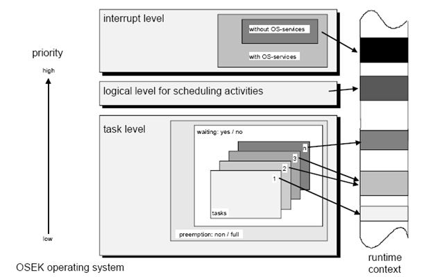 Каждая задача имеет приоритет. Стандарт ОС OSEK не ограничивает максимальное количество приоритетов - это определяет реализация. ОС OSEK определяет два уровня программ управления прерываниями, которые различаются возможностями вызова системных сервисов. Прерывания уровня 1 выполняются независимо от ОС очень быстро. Уровень 2 обеспечивает выполнение функций приложений, которые содержат вызовы ОС. События в ОС OSEK используются для синхронизации различных задач. События являются собственностью задач. Любая задача, в том числе и базовая, может установить событие, и только собственник события может ожидать или снять его. Управление ресурсами обеспечивает доступ к разделяемым ресурсам, таким как память, аппаратура и т.п. Планировщик также считается специальным ресурсом, который может быть захвачен задачами. Чтобы избежать инверсии приоритетов и тупиковых ситуаций, OSEK применяет потолочный протокол приоритетов. Согласно этому протоколу задаче, захватившей ресурс, временно повышается приоритет, и, таким образом, никакие другие задачи, обращающиеся к данному ресурсу, не смогут выполняться до тех пор, пока ресурс остается захваченным. Однако, все задачи с более высоким приоритетом, чем приоритет задачи, захватившей ресурс, все еще могут выполняться. Аварийные сигналы и счетчики в OSEK используются для синхронизации активации задач с повторяющимися событиями. Аварийный сигнал статически присваивается счетчику, задаче и воздействию. Воздействие может либо активировать задачу, либо установить событие. Счетчики оперируют тактами и могут представлять время, количество принятых импульсов и т.п. Каждая реализация обеспечивает один временной счетчик, который используется для планирования периодических событий. Все другие счетчики управляются через API, являются специфическими для конкретной реализации и не могут быть переносимыми. В OSEK существует два типа аварийных сигналов: циклические и одинарные. Циклические аварийные сигналы применяются для диспетчеризации задачи, которая должна запускаться периодически. Счетчик аварийного сигнала может быть установлен в относительное или абсолютное значение. Параметры цикла и значение счетчика могут переустанавливаться динамически. ОС OSEK обеспечивает минимальные средства для управления ошибками времени выполнения. Однако имеется возможность дополнительного управления ошибками во время разработки благодаря расширенной функциональности возврата управления. Причина такого решения состоит в том, что после того как продукт запущен в производство, большинство возможных ошибок может быть выявлено во время тестирования (такие как "неверный идентификатор задачи", " ресурс занят", "непредусмотренный вызов с уровня прерываний" и т.д.). Во время выполнения большинство системных сервисов не возвращает коды ошибок, но некоторые сервисы, такие как аварийные сигналы, которые могут стартовать и останавливаться динамически, возвращают код ошибки, если данный аварийный сигнал уже использовался. ОС OSEK определяет два типа ошибок - ошибки приложения и фатальные ошибки. При ошибке приложения, когда приложение пытается выполнить несанкционированную операцию (например, активизировать несуществующую задачу), целостность внутренних данных все еще сохраняется. Фатальные ошибки возникают, если ОС обнару