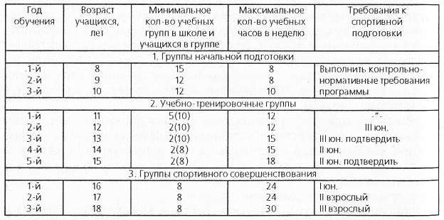 Таблица 2. Наполняемость групп начальной подготовки, учебных групп и режим учебно-тренировочной работы