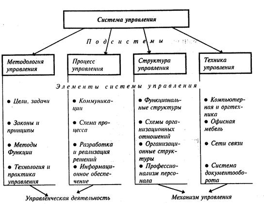 В нашем случае объектом исследования будет являться система управления (организацией.) Определим понятие системы управления – это совокупность звеньев, осуществляющих управление и связи между ними. СУ занимает определённое место в социальной системе предприятия, как было рассмотрено в части 1. Структуру самой системы управления можно представить в виде совокупности подсистем (рисунок 3.3).