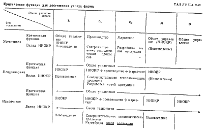 Соответственно в период перехода от одной технологии к другой становится жизненно важным, чтобы высшее руководство фирмы используя свою власть и влияние, добилось сокращения разработок продукции на основе старой технологии и освоения фирмой новой технологии. В табл. 2.4.2 представлена связь факторов, определяющих успех фирмы, с основными функциями управления. 1. В условиях стабильной технологии, когда успех деятельности определяется ценой продукции, производство выступает как основная движущая сила фирмы.