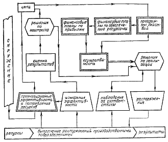 Следующим важным этапом была система управления на основе метода экстраполяции, представленная на рис. 4.2.4. Добавленные блоки отмечены двойным контуром. Коренное различие между системами управления методом контроля и методом экстраполяции состоит в том, что первая основана на прошлой деятельности, а последняя экстраполирует прошлое в будущее. Первый этап — использовать прошлые тенденции в качестве основы для прогнозирования будущих тенденций в окружении: народонаселении, экономике, технологии, конкуренции и других факторах. Исходя из прогнозируемой эффективности, определить тенденции изменения прибыльности фирмы. Второй этап — сравнить тенденции окружения и эффективность фирмы и определить цели фирмы. Обычно цели намечаются на уровне более высоком, чем вытекает из тенденций эффективности, для того чтобы стимулировать улучшение уже достигнутых результатов. Третий этап — преобразовать цели в скоординированную программу действий для различных подразделений фирмы. Эти программы содержат графики мероприятий, контрольные сроки. Программы мероприятий затем переводятся на язык финансовых планов распределения ресурсов: людей, материалов, денежных средств и площадей, необходимых для осуществления программ. Программы мероприятий и план распределения ресурсов служат основой для формирования планов по прибыли.