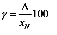 Очевидно, чем больше истинное значение измеряемой величины, тем выше при той же абсолютной погрешности точность измерения, т. е. меньше относительная погрешность. Безусловно, точность измерения зависит от точности прибора: чем точнее прибор, тем выше точность измерения. Но это не означает, что точность прибора можно оценивать по относительной погрешности. Такое суждение является неправильным, что иллюстрируется следующим примером. Пусть вольтметром с пределом измерения 100 В, измеряющим напряжения с абсолютной погрешностью ∆ U = 2 В, измерили два напряжения, истинные значения которых равны U1 = 100 В, U2 = 10 В. Тогда согласно выражению (5.1) δ1 = 2%, а δ2 = 20%. Другими словами, характеризовать точность прибора по относительной погрешности нельзя, так как она является величиной переменной, зависящей от численного значения измеряемой величины. В связи с этим точность приборов оценивается не относительной, а приведенной погрешностью. Приведенная погрешность γ по своему математическому смыслу представляет относительную погрешность, но выражает, отношение абсолютной погрешности не к истинному значению измеряемой величины, которое является переменным, а к величине, являющейся для данного прибора постоянной, - верхнему пределу измерениям xN (нормированному значению измеряемой величины):