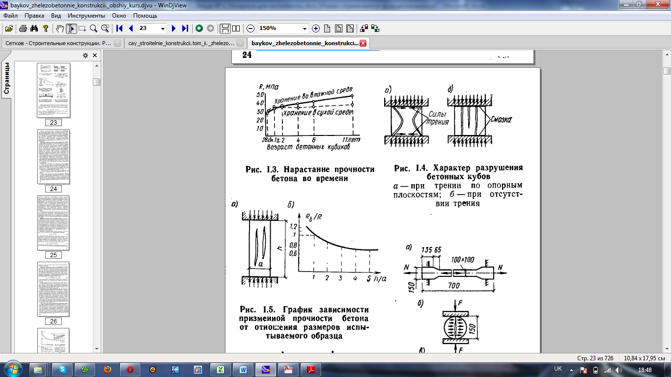 Рис. 2 К определению сжимающих напряжений в бетоне на границе микроразрушений Классы и марки бетона. В зависимости от назначения железобетонных конструкций и условий эксплуатации устанавливают показатели качества бетона, основными из которых являются: класс бетона по прочности на осевое сжатие В; указывается в проекте во всех случаях; класс бетона по прочности на осевое растяжение В; назначается в тех случаях, когда эта характеристика имеет главенствующее значение и контролируется на производстве; марка бетона по морозостойкости F; должна назначаться для конструкций, подвергающихся в увлажненном состоянии действию попеременного замораживания и оттаивания (открытые конструкции, ограждающие конструкции и т. п.); марка по водонепроницаемости W; назначается для конструкций, к которым предъявляют требования непроницаемости (резервуары, напорные трубы и т. п.); марка по плотности D; назначается для конструкций, к которым кроме требований прочности предъявляются требования теплоизоляции, и контролируется на производстве. Заданные класс и марку бетона получают соответствующим подбором состава бетонной смеси с последующим испытанием контрольных образцов. Высокое сопротивление бетона сжатию — наиболее ценное его свойство, широко используемое в железобетонных конструкциях. По этим соображениям основная характеристика — класс бетона по прочности на сжатие указывается во всех случаях. Классом бетона по прочности на осевое сжатие С (МПа) называется временное сопротивление сжатию бетонных кубов с размером ребра 15 см, испытанных через 28 дней хранения при температуре 20±2°С по ГОСТу с учетом статистической изменчивости прочности. Сроки твердения бетона устанавливают так, чтобы требуемая прочность бетона была достигнута к моменту загружения конструкции проектной нагрузкой. Для монолитных конструкций на обычном портландцементе этот срок, как правило, принимается равным 28 дням. Для элементов сборных конструкций заводского изготовления отпускная ирочность бетона может быть ниже его класса; она устанавливается по стандартам и техническим условиям в зависимости от условий транспортирования, монтажа, сроков загружения конструкции и др. Для бетонных и железобетонных конструкций принимаются, как правило, бетоны следующих классов и марок: 1) классов бетона по прочности на сжатие: С8/10; С12/15; С16/20; С20/25; С25/30; С30/35; С32/40; С35/45; С40/50; С45/55; С50/60; 2) марок бетона по морозостойкости: F50; F75; F100; F150; F200; 3) марок бетона по водонепроницаемости: W2; W4; W6. Влияние времени и условий твердения на прочность бетона. Прочность бетона нарастает в течение длительного времени, но наиболее интенсивный ее рост наблюдается в начальный период твердения. Прочность бетона, приготовленного на портландцементе, интенсивно нарастает первые 28 суток, а на пуццолановом и шлаковом портландцементе медленнее — первые 90 суток. Но и в последующем при благоприятных условиях твердения — положительной температуре, влажной среде — прочность бетона может нарастать весьма продолжительное время, измеряемое годами. Объясняется это явление длительным процессом окаменения цементного раствора — твердением геля и ростом кристаллов. По данным опытов, прочность бетонных образцов, хранившихся в течение 11 лет, нарастала в условиях влажной среды вдвое, а в условиях сухой среды — в 1,4 раз